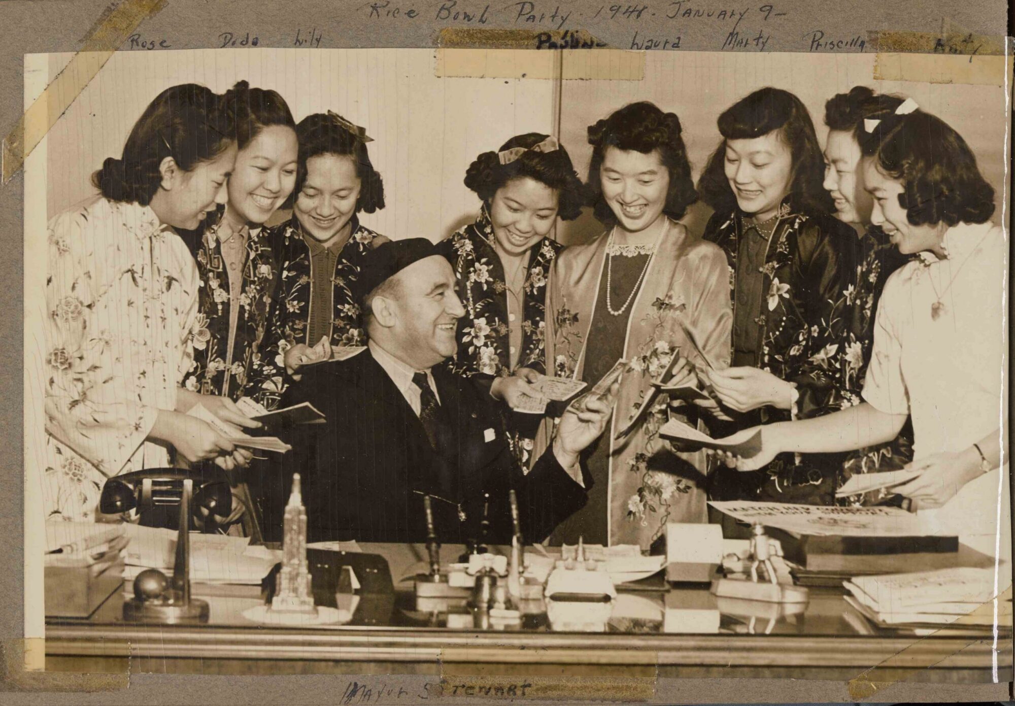The clippings and photographs she includes in this photograph album document the activities of the Chinese American community and her involvement. For example, there are two clippings related to an event called the “Rice Bowl Party.” According to the Smithsonian, between 1938 and 1941, Chinese Americans led fundraising efforts, known as Bowl of Rice parties, to raise money to aid Chinese civilians suffering in the Second Sino-Japanese War (1937-1945). Leaders organized Bowl of Rice party events in San Francisco’s and New York’s Chinatowns, along with over two thousand communities across the country. In the first clipping, Ada is featured as one of the organizers for a Bowl of Rice party in 1939.